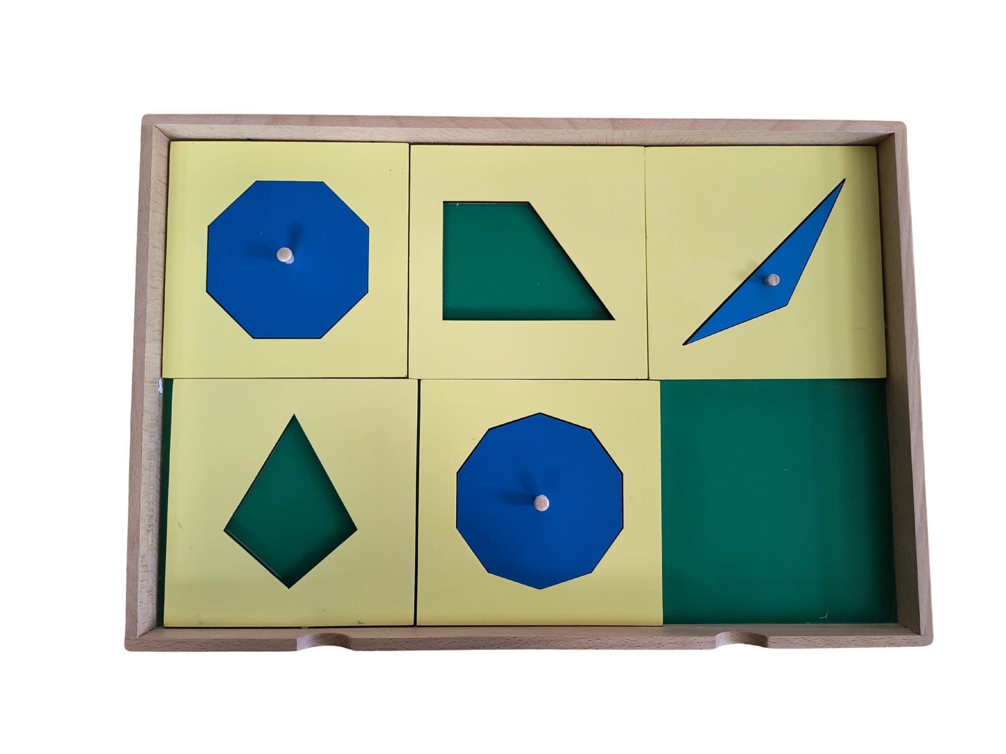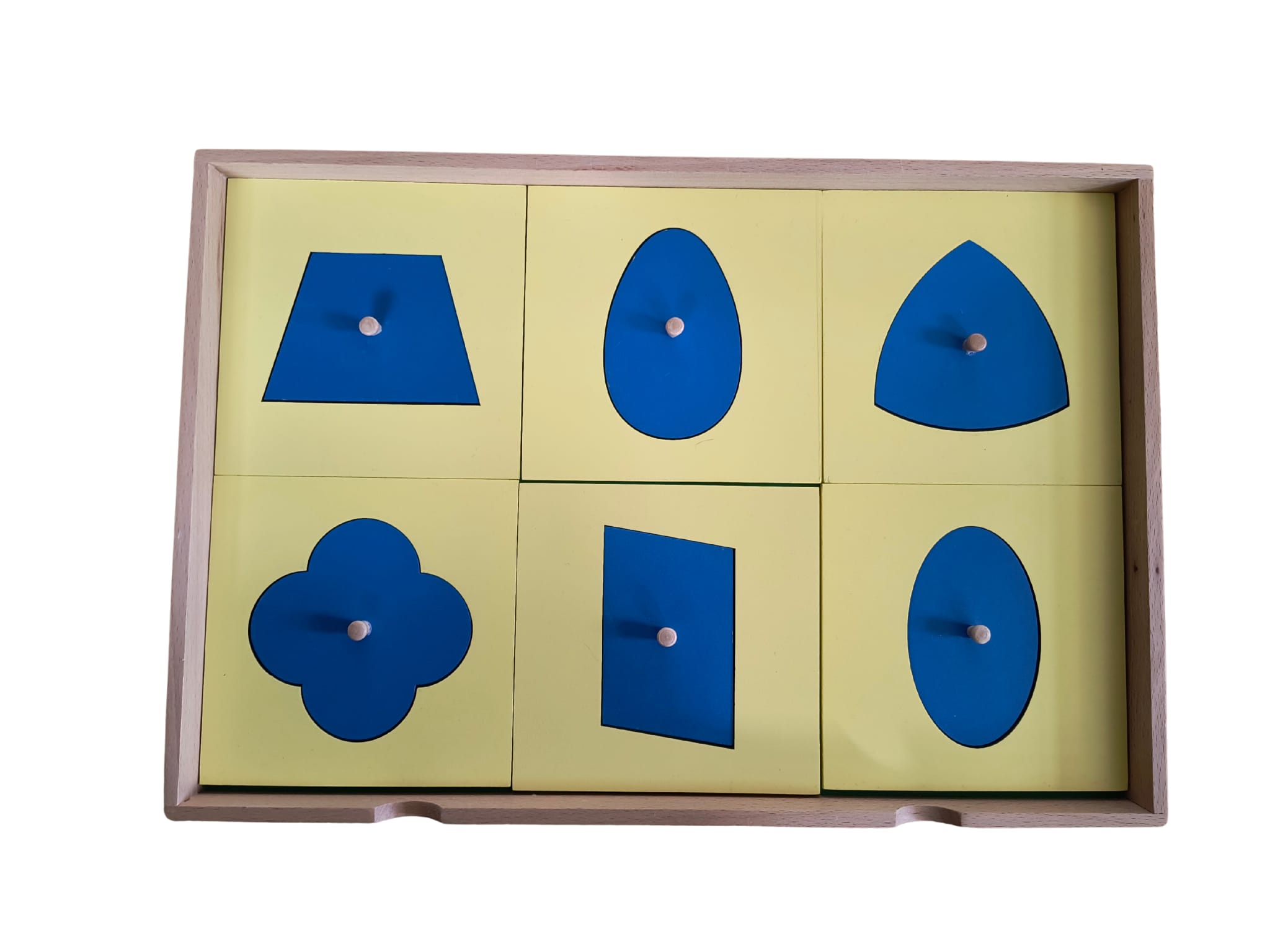 Wszystkie szuflady oraz figury geometryczne są wykonane z drewna. Figury mają kolor niebieski i posiadają uchwyt. Pomoc ta służy do doskonalenia zmysłu wzroku oraz nauki nazw figur geometrycznych.