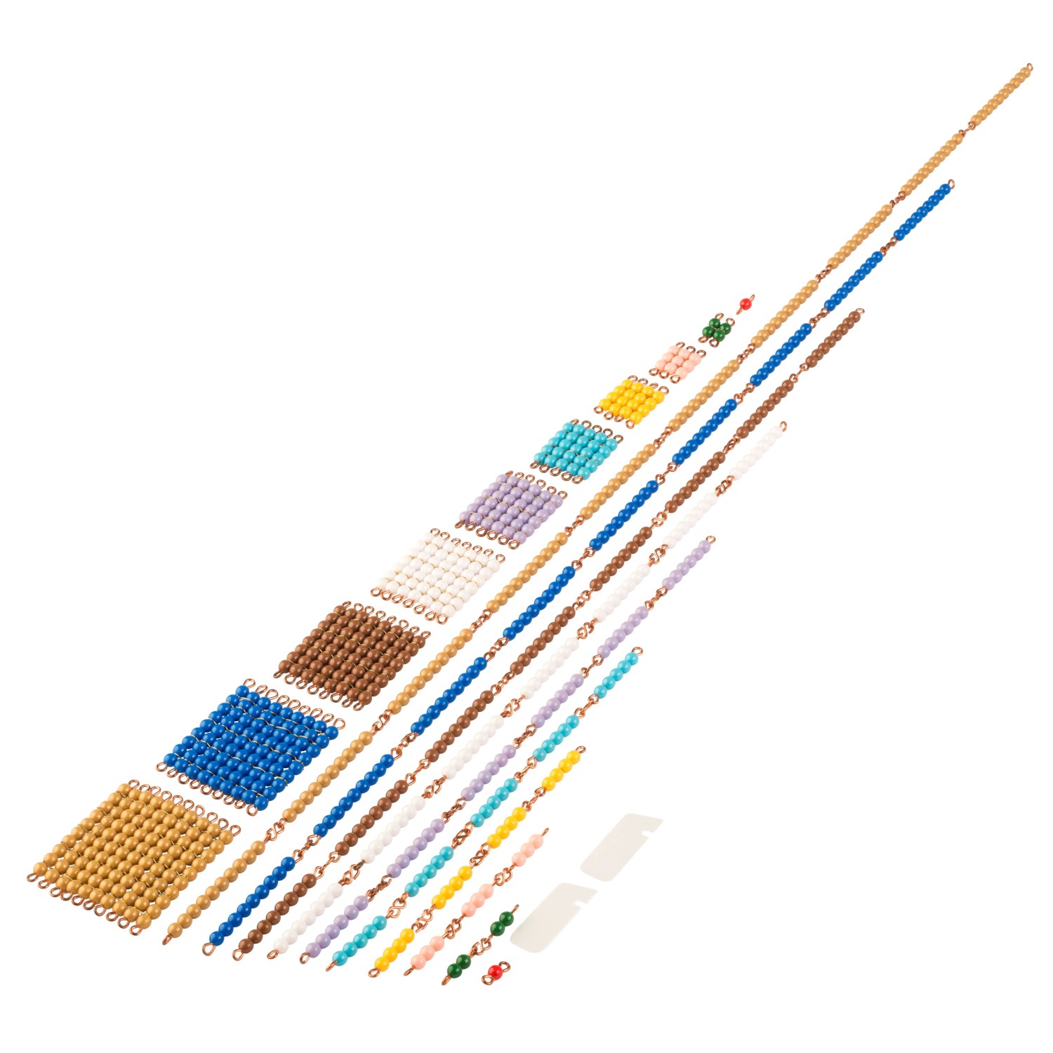 Ćwiczenia z krótkimi łańcuszkami przygotowują dziecko do mnożenia poprzez „przeskakiwanie” łańcuszków. W zestawie znajduje się również kwadratowy koralik dla każdej cyfry 1-10.